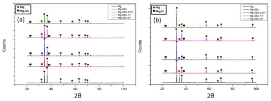 Table 3 shows the compositional analysis of Mg-Sn-Y alloys using energy dispersive spectroscopy. It could be seen from the table that the rod-shaped particles were rich in magnesium. With the addition of Y, the Mg content in these particles decreased. Whereas for the polygonal type particles, the composition of these secondary phases belonged to the same range, and they resembled the type Mg2(Sn,Y).