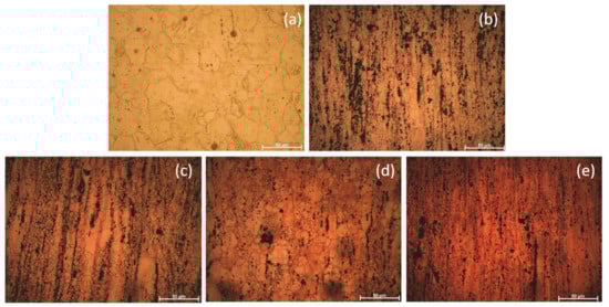 The recorded optical micrographs of Mg and its alloys are given in Figure 2. Grain size values calculated from these microstructures using ImageJ software are tabulated in Table 2. Pure Mg consisted of equiaxed grains, and the alloys comprised secondary phases of different sizes and shapes aligned in the extrusion direction. These phases existed mostly along the grain boundaries, and the grain sizes of the alloys were finer than pure magnesium. The grain size decreased with the addition of Sn and Y, but the addition of Y alone did not greatly affect grain refinement. This was also the case for as-extruded Mg-1Sn-xY (x = 1.5, 3, 3.5 at.%) alloys synthesized by Zhao et al. [22]. Higher amounts of Y (x = 5.09, 9.68, and 11.1 wt.%) led to an increment of grain size from 6 to 12 μm [22]. But since the amount of Y is within 2 wt.%, the grain size values were less. These longitudinal sections had extrusion lines that could be seen in the microstructure.
