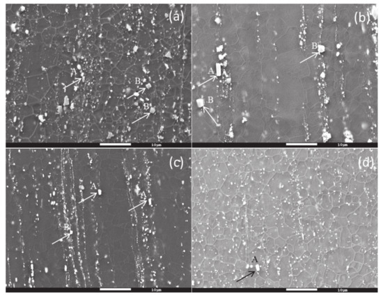 Figure 3 depicts the backscattered electron (BSE) images of Mg-5Sn-xY (x = 0, 0.5, 1 and 2 wt.%) alloys. It consisted of secondary phases oriented mostly in the extrusion direction. These phases were present both inside and along the grain boundaries. Several morphologies were identified, and they were of rod-shaped and polygonal-shaped particles. Similar results were seen for Mg-Sn alloys with minor additions of Cu and Ag by previous researchers [23]. The polygonal-shaped particles were mostly Mg2Sn type, and with the addition of Y, the number of such polygonal-shaped particles decreased. This was evident in the XRD, where the intensity for Mg2Sn decreases with the addition of Y. In Mg-5Sn-2Y, the complex rod-shaped particles of type (Mg83Sn1Y16) were hardly seen, and instead, several submicron globular shaped particles of type (Mg75Sn2Y23) were seen distributed homogeneously.