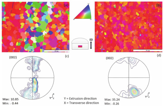 Figure 4 depicts the inverse pole figure (IPF) of as-extruded pure Mg and Mg-5Sn-2Y extruded at 350 °C with the observation direction parallel to the longitudinal (extruded) direction using SEM-EBSD. Pure Mg showed a basal texture. The addition of Sn and Y to Mg further strengthened the basal texture, as seen in Figure 4. The maximum intensity of basal poles for Mg-5Sn-2Y (35 m.u.d) was higher than for pure Mg (10 m.u.d). There is a difference in the distribution of poles between pure Mg and Mg-5Sn-2Y. The basal poles with the maximum intensities were oriented slightly towards (~20°) the TD from ND for pure Mg. For Mg-5Sn-2Y, they were oriented towards (~60°) the ED from the ND. The strengthening of basal texture could be due to the presence of second-phase particles due to the addition of alloying elements. Texture strengthening due to the addition of Sn to Mg was also seen by She et al. [24]. Additionally, a considerable decrease in the grain size could be seen with the addition of alloying elements.