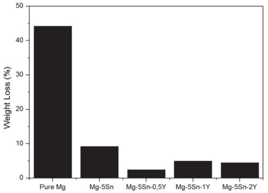 Figure 5 depicts the weight-loss measurements of Mg, Mg-5Sn, and Mg-5Sn-xY (x = 0.5, 1 and 2 wt.%) samples. After 48 h of immersion in 3.5 wt.% NaCl, a significant amount of corrosion products was formed on all the specimens, especially pure magnesium. A lot of corrosion products were skimmed out of the material and into the solution. These powder sediments made the color of the solution cloudy. It could be seen that the weight loss rate of these samples increased in this order of Mg-5Sn-xY < Mg-5Sn < Pure Mg. Hence the corrosion resistance decreases in the same order. Pure Mg suffered a 44% weight loss after 2 days of immersion. But the weight loss for Mg-5Sn-0.5Y was the least among all the materials, and it was only 3%. With substantial corrosion occurring in all the specimens, it was concluded that the time of 48h was too severe.