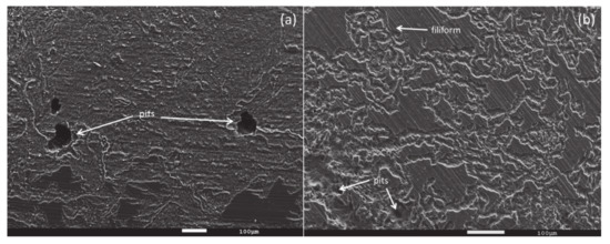 The corrosion morphologies for pure Mg and Mg-5Sn-0.5Y after immersing for 48h in 3.5 wt.% NaCl solution and cleaning with chromic acid are seen in Figure 6. Large pits could be seen for pure Mg, which were deep, and the corrosion process was initiated from the edges. Corrosion occurred throughout the sample. Whereas for Mg-5Sn-0.5Y, filiform-type corrosion occurred. Also, there were small pits observed. Since the second phases were not seen, they may have got dissolved during immersion. This could also be seen for corrosion of Mg-7Sn alloys, where the type of Sn distribution in the microstructure decides the corrosion mechanism [26]. If more Sn in the solution form in the matrix, then filiform corrosion mode activates, and if Sn is present as Mg2Sn throughout, then pitting corrosion takes over, which is more detrimental, as observed by Liu et al. [26]. With 5 wt.% Sn addition and not many pits could be seen after 48h immersion, it could be concluded that the corrosion process was not severe for the alloys with Sn and Y additions.