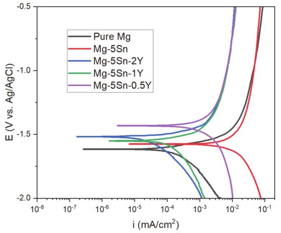 Figure 7 depicts the potentiodynamic polarization curves for the developed Mg-Sn-Y alloys in 3.5 wt.% NaCl solution. Pure Mg is plotted for reference. Here, the current response is plotted as a function of the applied potential, and the polarization characteristics are measured. The potential was applied from the cathodic region that corresponds to the H2 evolution reaction to the anodic region where Mg dissolution occurs. While moving the corrosion potential towards Ecorr, the corrosion current density decreased for all the samples. For Mg-5Sn, the value of cathodic current density is high. This means that at the onset of immersion, there existed an accelerated cathodic hydrogen evolution. In the graph, a shift in the positive direction for corrosion potential could be seen for increasing amounts of Y. Both anodic and cathodic branches shift to lower current densities with an increase in Y content. Table 4 demonstrates the corrosion properties of Ecorr (vs Ag/AgCl) and icorr values derived from this polarization plot. These values were calculated using the Tafel extrapolation method, i.e., by intersecting the slopes of anodic and cathodic curves.