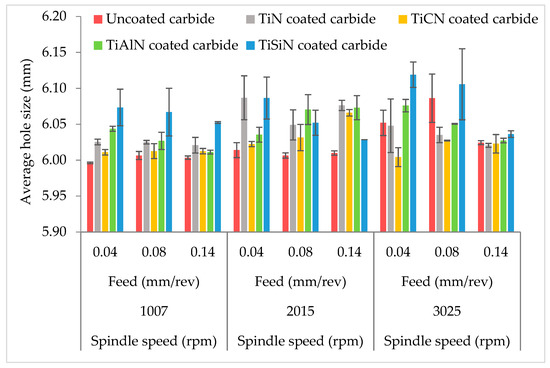 Diametric error is the deviation of holes from the nominal size for achieving high-quality holes [34]. The investigation of hole size in any manufacturing industry is essential when the drilling process is performed under dry conditions since a higher cutting temperature is expected due to the increased friction at the tool–chip interface [35]. Figure 2 shows the deviation of the hole from the nominal size (6 mm) for the uncoated and coated carbide drills (i.e., TiN, TiCN, TiAlN, and TiSiN). The results showed that the maximum hole deviations were found in holes drilled using TiSiN coated carbide drills, followed by TiAlN and TiN, irrespective of the drilling parameters. Interestingly, holes drilled using uncoated carbide drills showed the least deviation of hole size except for TiN and TiCN at high spindle speed. The TiAlN and TiSiN coated carbide drill gave the highest hole deviation under the selected cutting parameters during the multi-hole simultaneous drilling process.