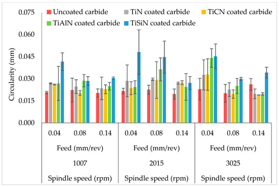 Another essential characteristic of hole quality is circularity. Circularity or roundness is the radial difference between the concentric circles that must be minimized [38]. Figure 3 showed that the uncoated carbide drill resulted in the lowest circularity error, except when drilling at the highest spindle speed. In the case of carbide coated drills, the TiCN coated carbide drill performed better by giving minimum circularity error following the TiN, TiAlN, and TiSiN. The minimum circularity error obtained in this result was 0.0197 mm for uncoated carbide drills, 0.0198 mm for TiN, 0.0190 mm for TiCN, 0.0197 mm for TiAlN, and 0.0271 mm for TiSiN. Figure 3 also shows that the circularity was also affected by the cutting parameters. Overall, the circularity error increased with the increase in spindle speed. However, in some cases, the circularity error decreased with the increase in the feed, especially at a high feed of 0.14 mm/rev. The highest influence on circularity error was due to the tool coating, as evident from Table 4 with a percentage contribution of 46.37%, followed by 13.77% significance of feed. The contribution of spindle speed was insignificant because ANOVA was run with a confidence interval of 95%. Therefore, p values more than 0.05 in the ANOVA result were considered insignificant [9].