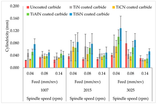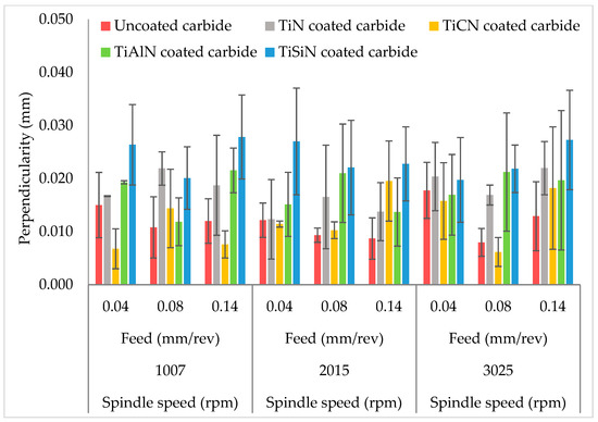 The cylindricity and perpendicularity of each hole are given in Figure 4 and Figure 5, respectively. The result indicates that under most of the cutting parameters used in this study, the uncoated carbide drill performed better by giving minimum cylindricity error. The TiSiN gave the highest cylindricity error following the TiAlN and TiN. Similarly, the lowest perpendicularity error was obtained using TiCN drill bits following the uncoated carbide drill bits, TiN, TiAlN, and TiSiN coated drills. The ANOVA results given in Table 4 for the cylindricity indicate that the tool coating had the highest contribution of 30.32% in the investigated range of cutting parameters. On the other hand, the spindle speed and feed had a significance of only 12.09% and 24.22%, respectively. In general, the cylindricity increased with the increase in the spindle speed. The tool coating also had a significant impact on the perpendicularity with a contribution of 61.29%. However, no significant effect of spindle speed, feed, and other interaction was found on the perpendicularity error.