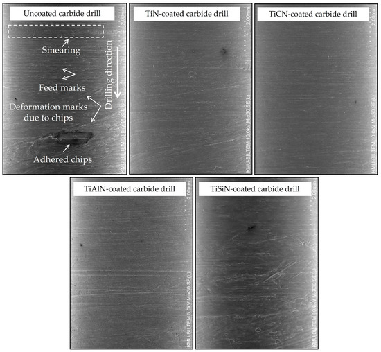 The functional performance of any structural part in a manufacturing industry highly depends on its surface quality. Therefore, the analysis of surface defects is crucial after any material-removing process for improving the surface quality of manufacturing components [41]. Figure 6 shows the scanning electron microscopy (SEM) images of the borehole surface of Al2024 produced by five different carbide drills under different cutting conditions. In general, the SEM micrographs showed the surface defects such as smearing, which is a thin layer of deformation at the hole’s surface that results from the continuous rubbing of the cutting tool with the borehole walls and occurs due to the ductility of the material [42]. According to Liang et al. [41], the rise in spindle speed and feed rate increased the temperature, which leads to the formation of smearing. Smearing also results in random chip debris and adhesive chips on the hole surface during machining. Other forms of damage observed include feed marks and deformation marks due to the collision of evacuated chips through the drill flutes with the borehole walls and chip adhesion. However, it is worth noting that no visible cracks were observed on the surface of all holes investigated during the multi-spindle drilling process. Figure 6 also shows that the smoothest hole surface with the least observable defects were for those drilled using the TiCN coated tools, especially at a high spindle speed of 3025 rpm following the TiN-coated drill. However, it appears that the uncoated carbide drill gave better hole surface, which was possible only at low cutting parameters. It is interesting to note that the damage and distortion of the hole surface were seen more in the hole surface produced by the TiSiN-coated carbide drill bits following TiAlN carbide drills under all the examined cutting conditions.