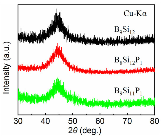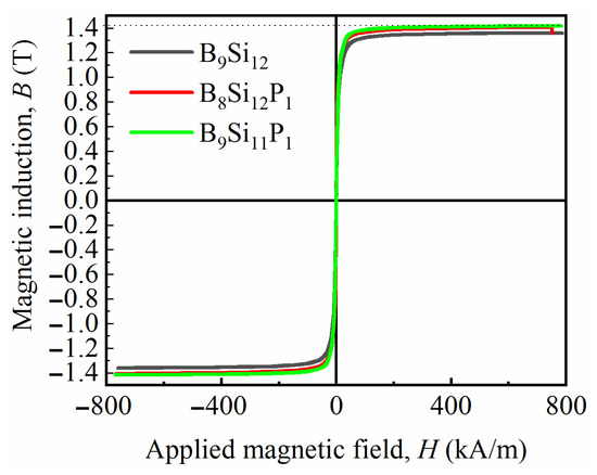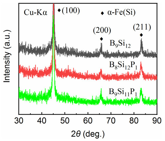 - Jia, Y.R.; Wang, Z.; Wang, F.; Han, Y.; Xie, Z.Y.; Li, L.J.; Zhang, L. Effect of P substitution for Nb on structure and soft magnetic properties of Si-rich FeCuNbSiB nanocrystalline alloys. Mater. Sci. Eng. B 2017, 222, 55–59. [Google Scholar] [CrossRef]