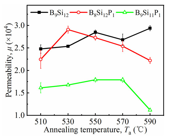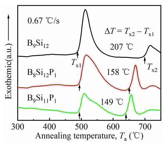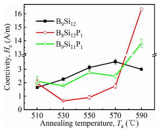 - Wang, C.; Li, J.; Zhang, X.; Wu, J.; He, A.; Dong, Y. Effect of P microalloying on magnetic properties and structure of FeSiBNbCu nanocrystalline alloy. J. Mater. Sci. Mater. Electron. 2021, 32, 4177–4184. [Google Scholar] [CrossRef]