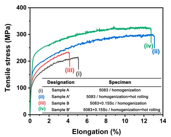 | Sample B’ | 5083 + 0.15Sc/ homogenization + hot rolled | 214 | 330 ± 10 | 12.4 ± 1.1 |
