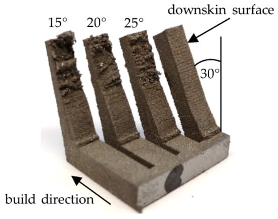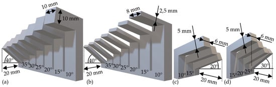 In order to show geometry limits and the influence of the introduced energy as well as the influence of an extended layer time in cw processes, the test specimens in Figure 2a,b with overhang thicknesses of 2.5 mm and 10 mm are used. The test specimens consist of overhang structures with angles in the range of 10–40°, which are varied in steps of 5°. Flatter angles are arranged in higher z-positions to reduce interference in the manufacture of the various angles.