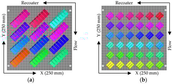 The build job design for the different test specimens from Figure 1 is shown in Figure 4. In accordance with VDI 3405 Part 2 [], the test specimens are placed at an azimuth angle of 45° to the coating and gas flow direction with the open angle ends oriented in the coating direction. This arrangement prevents protruding test specimens from being approached head-on by the coater blade and increases process robustness. The twisted arrangement prevents scan paths in the direction of the shielding gas flow during contour runs or runs parallel to the contour. In this way, undesirable interactions between discharged process emissions and the laser radiation are reduced.