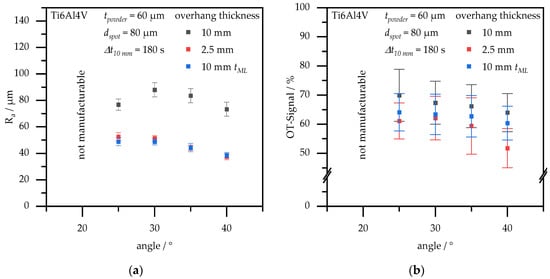Measured roughnesses Ra (a) and OT signal (b) with commercial cw process parameters with varying specimens, overhang angles, and layer times.
