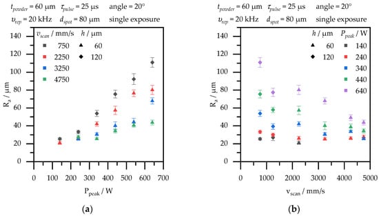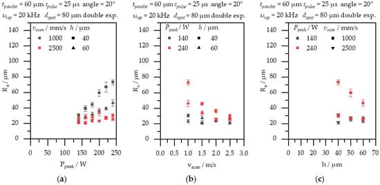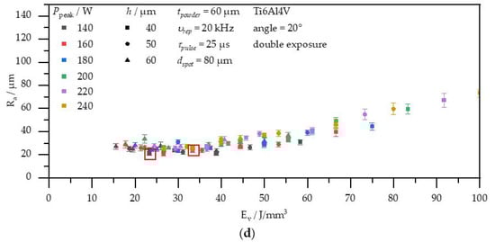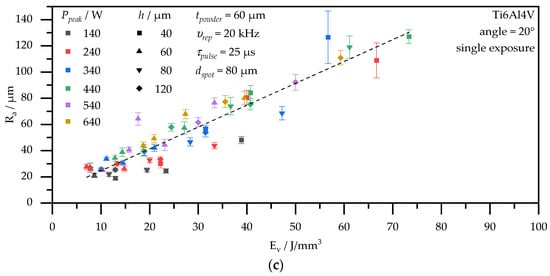 Figure 6a,b show increasing roughnesses Ra for increasing laser power Ppeak and decreasing scanning speed vscan. Summarizing the varied and constant process parameters into the volume energy density (see Equation (4)), it can be seen in Figure 6c that volume energy densities Ev and roughnesses Ra are strongly correlated. High volume energy densities Ev lead to high roughnesses Ra.
