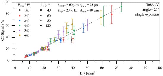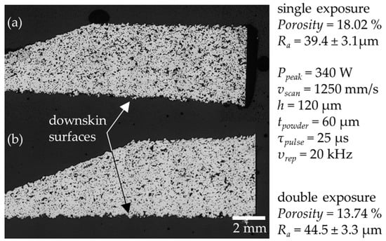 Figure 7 shows the measured OT signals as a function of the volume energy density Ev. As can be seen, the introduced volume energy density and the signal delivered by OT are strongly correlated. As the volume energy density decreases, the standard deviation of the OT signal also decreases. Consequently, the introduction of lower volume energy densities Ev lowers the average temperature in the overhang structures during pulsed processes, resulting in smoother processes and lower roughness on the downskin surfaces of the test specimens. However, the lower energy input leads to increased porosities (see Figure 8). Using the parameter set shown in Figure 8 as an example, it can be found that double exposure has the potential to reduce porosity (by 23.8%) with increasing roughness (by 12.9%). For these reasons, the double exposure test series is designed as described in Section 3.4.
