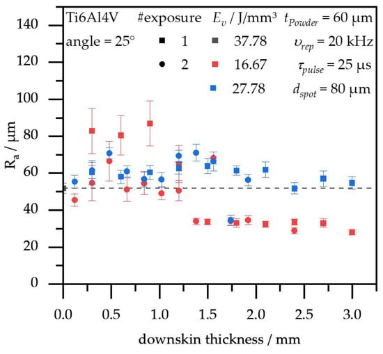 One possible hypothesis is that the cw infill exposure introduces energy into the material at a level at which the heat capacity and thermal conductivity of the downskin region are no longer sufficient to dissipate the heat owing to the increased porosity. As a result, the downskin area overheats, which leads to increased roughness and, in extreme cases, even reduces the manufacturability of the specimen. The larger the gap between the energy densities, the higher the porosity in the downskin area, which intensifies the effect. This hypothesis is supported by the high roughnesses in single exposures with Downskin 2 (Ev ≈ 17 J/mm³). In these specimens, the double exposure presumably reduces the porosity, so that the increase in roughness is lower. Above a certain downskin thickness (approximately 1.3 mm in the example shown), the temperature at the interface between the powder bed and the downskin surface is no longer critical for roughness increase. As temperature increases occur in deeper layers, it cannot be detected with the existing system technology.