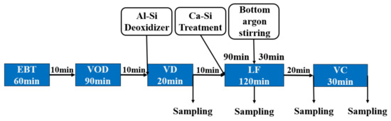 In this paper, the actual smelting process of 15-5PH stainless steel in a steel plant in China was analyzed. This study investigates the formation mechanism of DS-type inclusions in 15-5PH stainless steel castings. The particular steelmaking process route of 15-5PH stainless steel was as follows: eccentric bottom-tapping electric arc furnace (50t EBT)→vacuum oxygen decarburization unit (VOD)→vacuum degasser (VD)→ladle furnace (LF)→vacuum casting (VC), and the process flow diagram is shown in Figure 1. The molten steel was poured into the ladle after the scrap and alloy were melted in the alloy melting furnace. The decarburization was carried out at the VOD station. After vacuum oxygen decarburization was completed, its device was turned on to add Al-Si alloy to the ladle. And then increasing the bottom blowing argon flow rate to strongly stir the molten steel in the ladle. After 10 min, lime and fluorite were added to make slag, then vacuum decarburization began for VD treatment. After VD treatment was finished, Ca-Si alloy was added into the ladle and argon was injected to improve the removal rate of inclusions. When the chemical composition and temperature were suitable, the ladle was transported to the vacuum casting platform for ingot casting. The VD-end samples were collected after VD treatment. LF-end samples were sampled from the ladle after calcium treatment and argon injection. VC-onset samples were collected before vacuum casting. The ingot casting sample was taken from the vacuum casting to complete the ingot. A schematic of the sampling positions is shown in Figure 1.