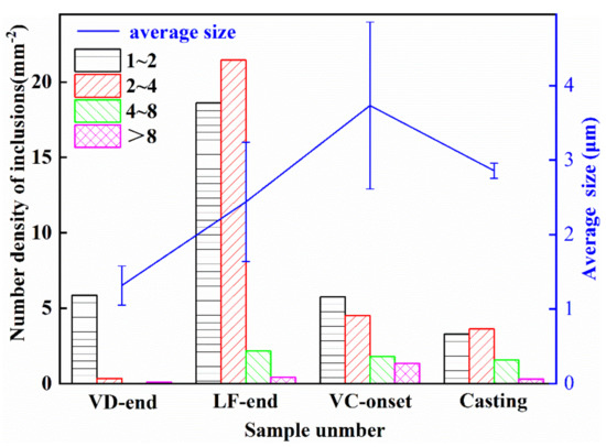 Figure 4 shows the size distribution measurement results. Inclusions were classified according to size: 1–2, 2–3, 3–4, 4–8, and >8 μm. The inclusion density in sample VD-end (after the Al-Si addition) was 6.3 inclusions per mm2 and the average inclusion size was 1.5 μm. After adding Ca-Si, the average inclusion density reached a maximum of 42.64 inclusions per mm2. This was mainly because the VD process time was too short for the deoxidation reaction to reach equilibrium; instead, equilibrium was reached at the LF. The average inclusion size reached a maximum before vacuum casting, and the average inclusion size was 3.57 μm. The increase of average size of inclusions was mainly caused by the growth and aggregation of inclusions. With the flotation and removal of inclusions in the casting process, the density was reduced to 8.78 inclusions per mm2 and the average size was reduced to 3.13 μm. The error analysis results in Figure 4 show that the deviation of inclusion size for the VC-onset sample is the largest, which was due to the existence of the large number of large size inclusions in the VC-onset sample, which further indicates that the inclusion size of VC-onset sample is the largest in the smelting process of 15-5PH stainless steel.