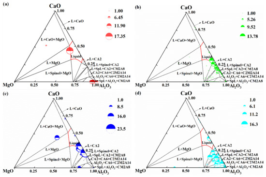 A ternary diagram of CaO–MgO–Al2O3 calculated by FactSage 8.0 software (Thermfact/CRCT, Montreal, Canada and GTT-Technologies, Aachen, Germany)was used to describe the evolution of inclusions after addition Al-Si, Ca-Si alloys and ingot casting, as shown in Figure 5. Isothermal temperature of diagrams were 1873 K and the red line represents the liquid oxide phase region. As shown in Figure 5a, after adding Al-Si alloy, the inclusions were mainly located near the spinel. There were also a small amount of inclusions in or near the liquid oxide phase region. As shown in Figure 5b,c, after the addition of Ca-Si alloy, the mass fraction of CaO in the inclusions increases gradually, so that the spinel is modified into liquid or dual-phase inclusions. The size of inclusions is also increasing, and the size of inclusions in the VC-onset samples reached the maximum size. During the process of vacuum casting, inclusions in molten steel move to the corner of Al2O3, as shown in Figure 5d. This means that the mass fraction of Al2O3 in inclusions increases and the average particle size of the inclusions decreases.