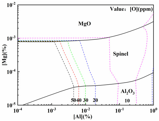 (2) MgO could be reduced by [Al] at the metal-slag and metal-lining interfaces to which [Mg] can form, as shown in Equation (1). With more Mg content added, Al2O3 mainly transforms into one type: Al2O3·MgO,