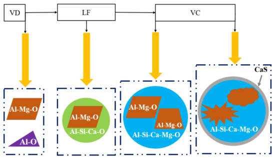 (4) CaO–Al2O3–SiO2 would appear by adding excessive [Ca], [Al], [Si], and [O] (Equation (3)), they, together with CaO-MgO-Al2O3, tended to produce large inclusions, and then the CaS forms as a shell. DS-type inclusions were generated if the inclusion sizes exceed 13 μm. A diagram of this mechanism is shown in Figure 8.