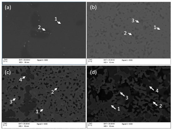 SEM images of the samples and related EDS analyses are shown in Figure 1 and Table 1, respectively. The binary Cu50Zr50 alloy (see Figure 1a) appears to consist of a CuZr matrix containing the secondary phase Cu10Zr7. This result is consistent with previous work [7,9,14,24].