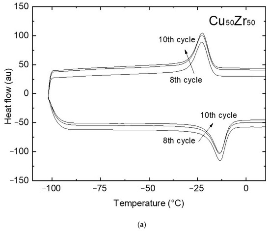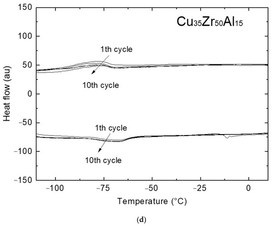 DSC scans of stabilized Cu50Zr50 and Cu(50−x)Zr50Alx alloys in fully annealed condition are shown in Figure 3. As previously reported by the authors [9,10], the binary alloy exhibits unstable behavior. The MT temperatures are initially above 100 °C. Upon thermal cycling, they are shifted down to lower temperatures (martensite start temperature, Ms = 150 °C at the first cycle, Ms = −20 °C at the 8th cycle). After the 8th cycle no variation in DSC signals is detected, as depicted in Figure 3a, and the MT shows stable behavior below 0 °C. The stabilized transformation is also characterized by a much narrower thermal hysteresis (less than 10 °C).