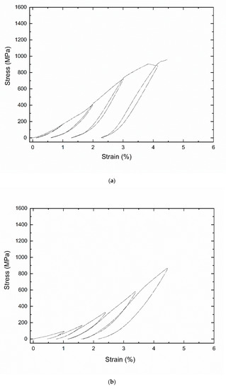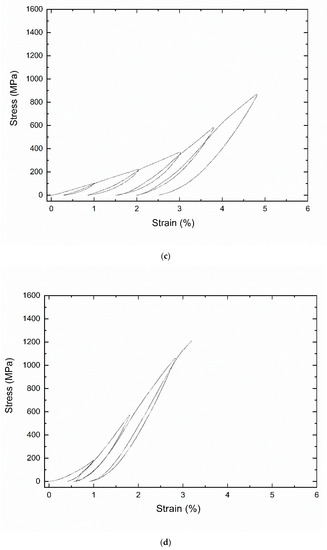 In details, the thermally stabilized binary CuZr alloy shows perfect linear behavior during the first cycle, while the second one exhibits a superelastic behavior with a more than intensive linear strain hardening effect, which is correlated with the high temperature phase (see DSC scan of Figure 3a). This response remains present up to the fifth cycle, during which the failure occurred before reaching the maximum stress during the loading. The addition of Al in the range between 5% and 10% provokes an increase in the values of the recoverable strain during each cycle and the failure cannot be reached within the fifth cycle. The loading and unloading slopes are much lower for these compositions of the ternary system, if compared with the binary alloy. On the contrary, higher Al content clearly induces a brittle response (see Figure 6d), which is supported by an increase in brittleness. The alloy fragility could be correlated with the accumulation of defects or residual stresses, previously detected by the XRD analysis. In fact, the failure of the last composition was found during the loading of the fourth cycle, therefore corresponding to the minor number of mechanical cycles.
