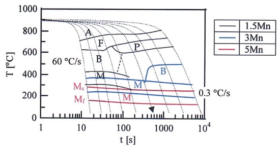 CCT diagrams of the 1.5 Mn, 3 Mn and 5 Mn steels. “A”, “F”, “P”, “B” are austenite, ferrite, pearlite, bainite, and martensite, respectively.