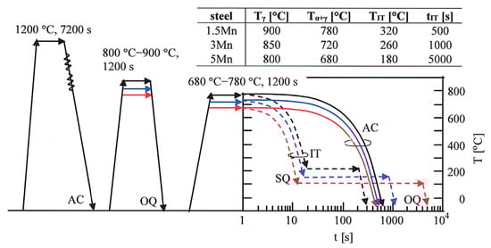 Heat treatment diagram of the AC and IT processes in the 1.5 Mn (black line), 3 Mn (blue line), and 5 Mn (red line) steels. OQ: quenching in an oil bath (53.5 °C/s), SQ: quenching in a salt bath (24.0 °C/s), AC: air cooling (1.2 °C/s).