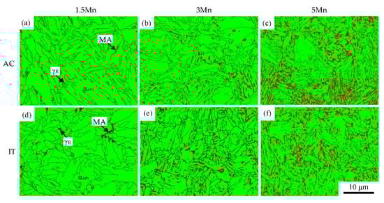 Phase maps of SEM-EBSD in the 1.5 Mn, 3 Mn and 5 Mn steels subjected to (a–c) the AC and (d–f) IT processes. Green and red phases denote annealed martensite (αam) and reverted austenite (γR), respectively. “MA” represents the martensite-austenite phase. Average lath sizes of annealed martensite in the 1.5 Mn, 3 Mn, and 5 Mn steels subjected to the AC and IT processes are 4.3 μm, 3.1 μm, and 2.4 μm, respectively.
