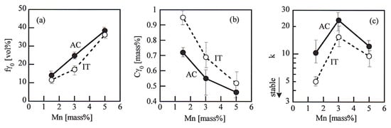 Variations in (a) initial volume fraction (fγ0), (b) initial carbon concentration (Cγ0), and (c) strain-induced transformation factor (k) of reverted austenite as a function of Mn content in the steels subjected to the AC (●) and IT (○) processes after intercritical annealing.