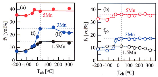 The thermal stability of the reverted austenite was evaluated in a temperature range between −196 °C and 300 °C by measuring the volume fraction change of the reverted austenite transformed on cooling in dry ice, ethyl alcohol, and/or liquid nitrogen, and on heating in water and using a pair of plate heaters (70 × 90 mm2). A holding time of 1200 s was used for cooling and heating. The mechanical stability of the reverted austenite was defined using “the strain-induced transformation factor k” in the following equation [11,21,35],