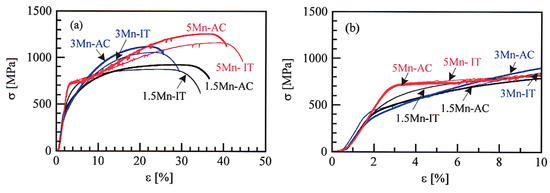 Engineering stress–strain (σ-ε) curves of (a) overall and (b) early strain ranges in the 1.5 Mn, 3 Mn, and 5 Mn steels subjected to the AC (thick lines) and IT (thin lines) processes.