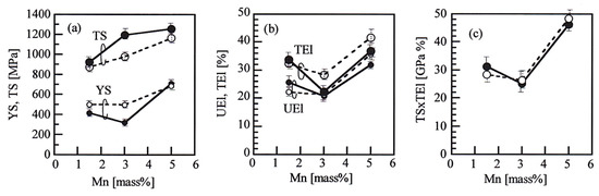 In both processes, the 5 Mn steel exhibits the highest yield stress and tensile strength and the largest uniform and total elongations owing to the TRIP effect or SIMT hardening by a large amount of metastable reverted austenite and solid solution hardening by high Mn concentration, although the reduction of the area is the lowest [21]. The 5 Mn steel exhibits a superior TS × TEl (>45 GPa%). The 3 Mn steel possesses lower yield stress and higher tensile strength than the 1.5 Mn steel. The uniform and total elongations and reduction of the area are lower than those of the 1.5 Mn steel, despite a high reverted austenite fraction. The TS × TEl of the 3 Mn steel is lower than that of the 1.5 Mn steel.