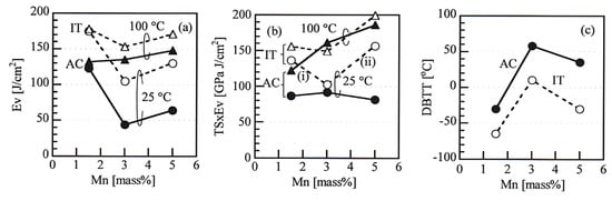 Figure 8a,b shows the Mn content dependences of the Ev and the product of TS and Ev (TS × Ev) at Tt = 25 °C and 100 °C in the steels subjected to the AC and IT processes, respectively. The AC process deteriorates the Ev and TS × Ev at 25 °C in all steels, compared to the IT process. In both processes, the 3 Mn steel exhibits minimum Ev. The Ev and TS×Ev are considerably increased by 100 °C test with shorter error bars than them at 25 °C, especially in the 5 Mn steel subjected to the AC process. In this case, the Ev of the 5 Mn steel is higher than that of the 1.5 Mn steel because an upper shelf Ev appears at temperatures above 100 °C as mentioned later. The TS × Evs at 100 °C of the 3 Mn and 5 Mn steels subjected to the AC and IT processes are nearly the same (Figure 8b).