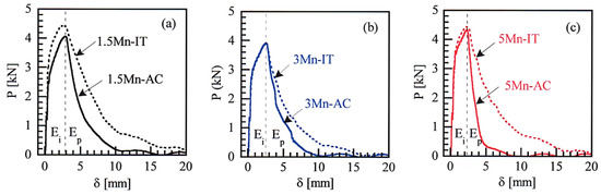 Impact load-displacement (P-δ) curves at Tt = 25 °C of (a) the 1.5 Mn, (b) 3 Mn, and (c) 5 Mn steels subjected to the AC (thick lines) and IT (thin lines) processes. Ei and Ep are crack-initiation and propagation energies, respectively, where Ei + Ep = Ev.