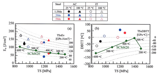 Figure 10a shows the relation between the Ev and TS in the 1.5 Mn, 3 Mn, and 5 Mn steels subjected to the AC and IT processes which was tested at Tt = 25 °C and 100 °C. At a testing temperature of 25 °C, the 5 Mn steel subjected to the AC process shows an equal Ev and TS × Ev to JIS-SCM420 steel quenched and tempered, and the 3 Mn steel exhibits lower Ev and TS × Ev than JIS-SCM420 steel. On the other hand, the Ev and TS × Ev at Tt = 100 °C of the 5 Mn steel subjected to the AC and IT process significantly increase compared to those of JIS-SCM420 steel, in the same way as the 3 Mn steel. When compared to the Ev of martensite-type 5 Mn steel, the TS × Evs at Tt = 100 °C of 5 Mn steel subjected to the AC and IT processes are higher than that at Tt = 25 °C (151.4 GPa J/cm2) of martensite-type 5 Mn steel [23].