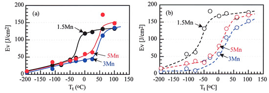 Variations in Charpy V-notch impact value (Ev) with impact test temperature (Tt) in the 1.5 Mn, 3 Mn, and 5 Mn steels subjected to (a) the AC and (b) IT processes. (b) is reprinted with permission from Spring Nature: Metall. Mater. Trans. A, Copyright 2021.