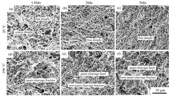 SEM images of fracture surface in the 1.5 Mn, 3 Mn, and 5 Mn steels subjected to the AC process after impact tests at (a–c) 25 °C and (d–f) −196 °C.