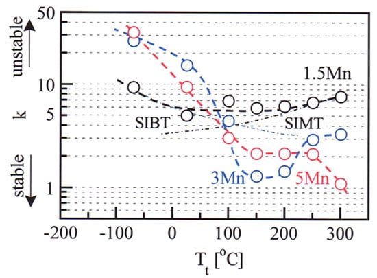 Variations in k-value with tensile test temperature (Tt) in the 1.5 Mn, 3 Mn and 5 Mn steels subjected to the IT process [36]. “SIMT” and “SIBT” represent the strain-induced martensite and bainite transformation, respectively. Reprinted with permission from Wily-VCH GmbH, Weinheim: Steel Res. Int., Copyright 2021.