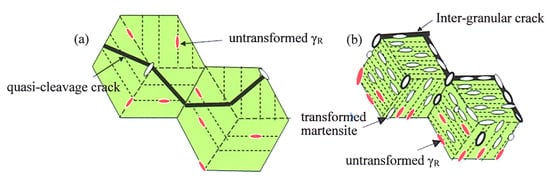 - Torizzo, Q.; Maziere, M.; Perlade, A.; Gourgues-Lorenzon, A.-F. Effect of austenite stability on the fracture micromechanisms and ductile-to-brittle transition in a medium-Mn, ultra-fine-grained for automotive applications. J. Mater. Sci. 2020, 55, 9245–9257. [Google Scholar]