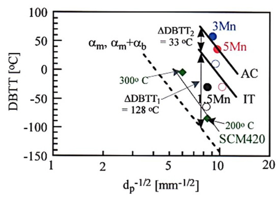 where E and Z are the material’s constants. The unit crack path is corresponding to the packet size. Figure 15 shows the relation between the DBTT and dp for various steels. The DBTTs of quenched and then tempered JIS-SCM420 steel are also plotted in the figure. In this case, the grain facet sizes of the 3 Mn and 5 Mn steels were assumed to be the same as the dp. If the slopes of these DBTT versus log dp−1/2 lines are assumed to be similar to that reported by Kunitake et al. [45], the 3 Mn and 5 Mn steels subjected to the IT process had higher DBTTs by 128 °C (ΔDBTT1) than the 1.5 Mn steel and JIS-SCM420 steel. This means that the dp of cleavage fracture is equivalent to grain facet size in the 5 Mn steel and the ΔDBTT1 is associated with the inter-granular fracture.