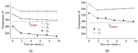 As can be seen from Figure 1a, the sequence of direct transformations in all specimens was B2→R→B19′. It can also be seen that the martensite transformation temperatures decreased steeply, even after abc pressing to e = 1.84. As the true strain further increased, the temperature TR remained almost unchanged, and the temperatures MS and Mf decreased linearly with e. The temperature interval between MS and Mf remained nearly constant for all values of e.