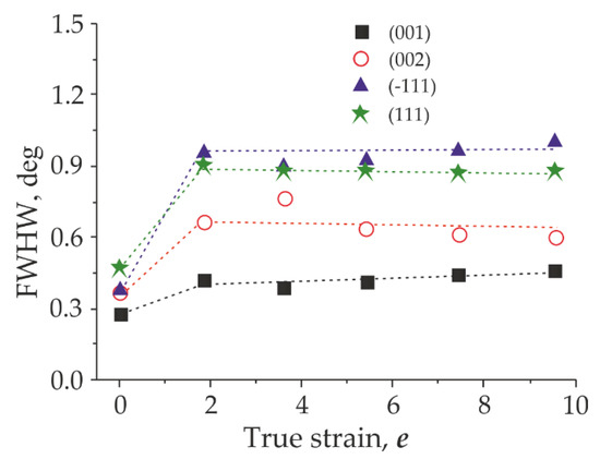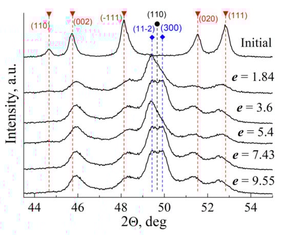 Figure 4 shows the full-width at half maximum (FWHM) of the most intense B19′ peaks at different true strains. It can be seen that at e = 1.84, the FWHM of these peaks increased steeply, and further, their weak dependence on e can be observed.