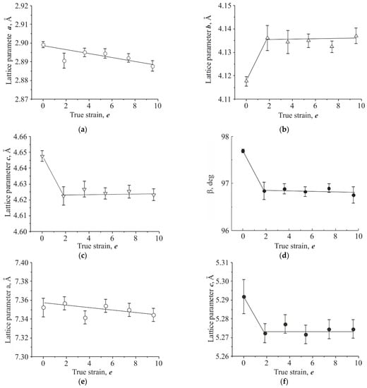 Figure 3 shows the R and B19′ lattice parameters at different true strains. It can be seen that at e = 1.84, the B19′ lattice parameter a decreased somewhat, and further, it weakly depended on e (Figure 3a). At the same time, the parameters b, c, and the angle β at e = 1.84 changed steeply, and further, their e dependence weakened (Figure 3b–d). The R lattice parameters a and b after abc pressing remained almost the same as before abc pressing (Figure 3e), whereas the parameter c decreased markedly at e = 1.84, and further, it weakly depended on e (Figure 3f).