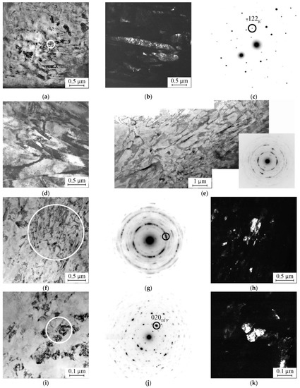 The influence of abc pressing on the microstructure and phase state of the alloy was analyzed by transmission electron microscopy and selected area diffraction, which confirmed the results of our XRD analysis. At room temperature, the initial and abc pressed specimens, irrespective of the true strain, contained R and B19′ phases. Their reflections in the initial alloy and alloy abc pressed at e = 9.55 are marked in Figure 7c and Figure 7g,j, respectively. In all specimens, no B2 phase was found.