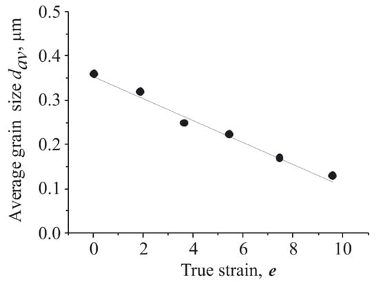 The average grain–subgrain size, dav, was determined from dark-field images such as those shown in Figure 7b,h,k. First, the absolute area of each luminous region was determined and then all such regions were approximated by a square with a side length that was taken equal to dav. The results are presented in Figure 8. As can be seen from the figure, the average grain–subgrain size dav, according to TEM, decreased almost linearly with the increase in the true strain, and at e = 9.55, it measured approximately 130 nm.