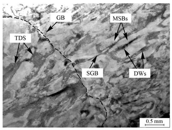 Characteristic microstructural elements of Ti49.8Ni50.2 after abc pressing to e = 5.4: GB—grain boundary, SGB—subgrain boundary, DWs—dislocation walls, TDS—tangled dislocation structure, MSBs—microshear bands; (enlarged fragment of TEM image in Figure 7e).