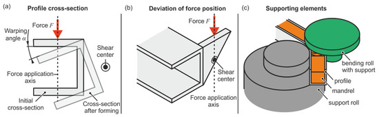 Countermeasures to reduce warping in profile bending profiles for the example of a U-profile. (a) profile cross-section with the shear center as cause for warping, (b) countermeasure: moving the position of force application by altering the profile geometry. (c) countermeasure: use of supporting elements.